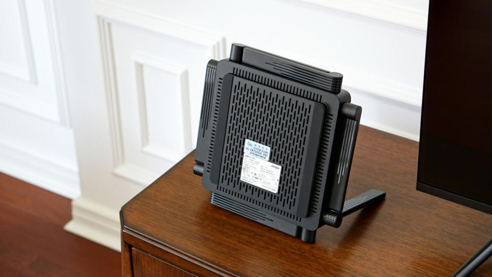 八个天线完全膨胀后的状态,天线上的“WiFi 6”这个字很醒来,X32 PRO支持Wi-Fi 6标准。该机的八个天线均匀设计,其中四个是2.4GHz天线,其中四个是5GHz天线,它们都是5dbi高增益天线,无线信号的覆盖率大大增加.