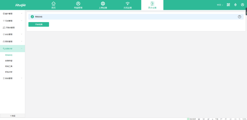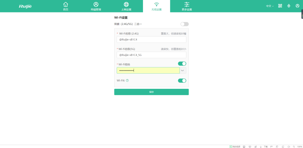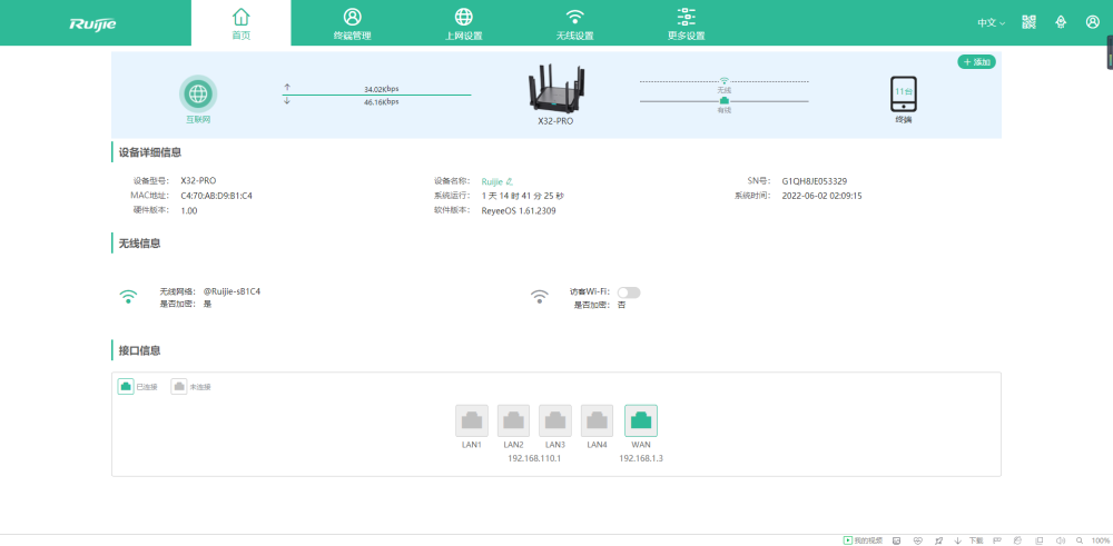 首次使用路由器,用户需要在网页末端执行相关操作。你只需要设置一些简单的步骤,如路由器管理页面的登录密码、WiFi密码和如何连接到互联网,可实现移动设备的互联网访问。进入快速星YaoX32 PRO管理接口后,用户可以在主页上实时查看当前网络连接状态、网络速度、端口信息等,快速了解设备的运行情况.在整个页面设计中,锐捷也进行了简化。除首页外,该机器还具有终端管理、互联网设置、无线设置和更多的设置四页,它易于第一次使用。