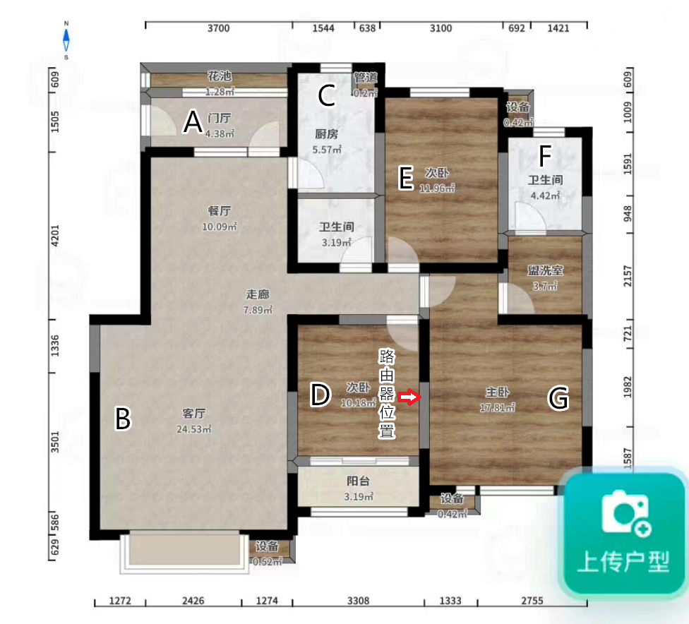据官方介绍,X32 PRO有8个高性能天线、8个独立信号放大器,并支持8个空间流。双频同时速度为3202Mbps,覆盖范围可达到144O+。作者的居住环境是三个房间,两个大厅和两个警卫,房子的面积大约是137度,路由器位于图中所示的特定位置。