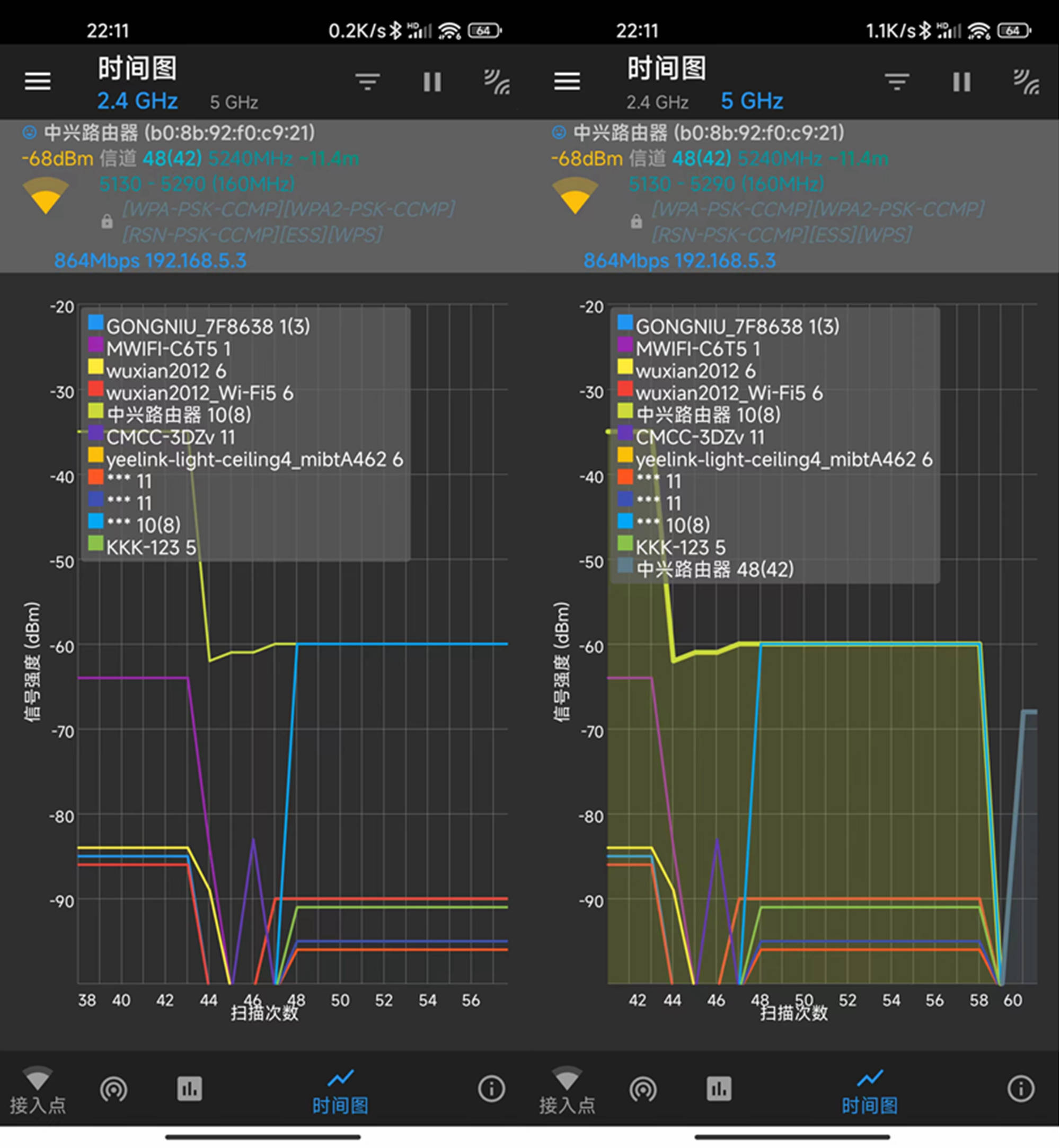 A的信号强度变化,你可以看到,在35dBm左右稳定,波动很小;而5G信号强度基本上是抑制的,波动也很小。