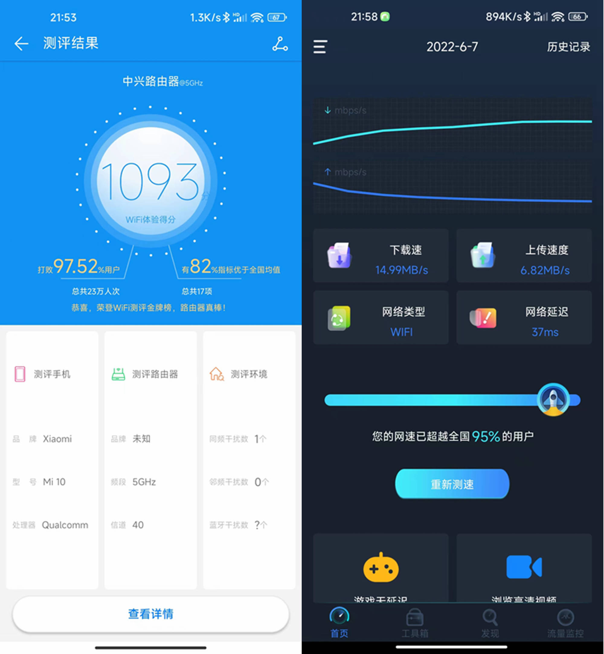 测试结果很好,分数更高;我的家有200M的带宽,但手机应用程序测试下载基本上是15MB/s,应用程序测试有错误。