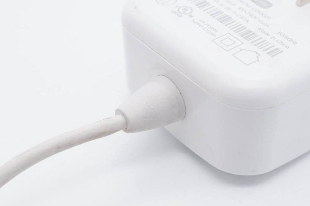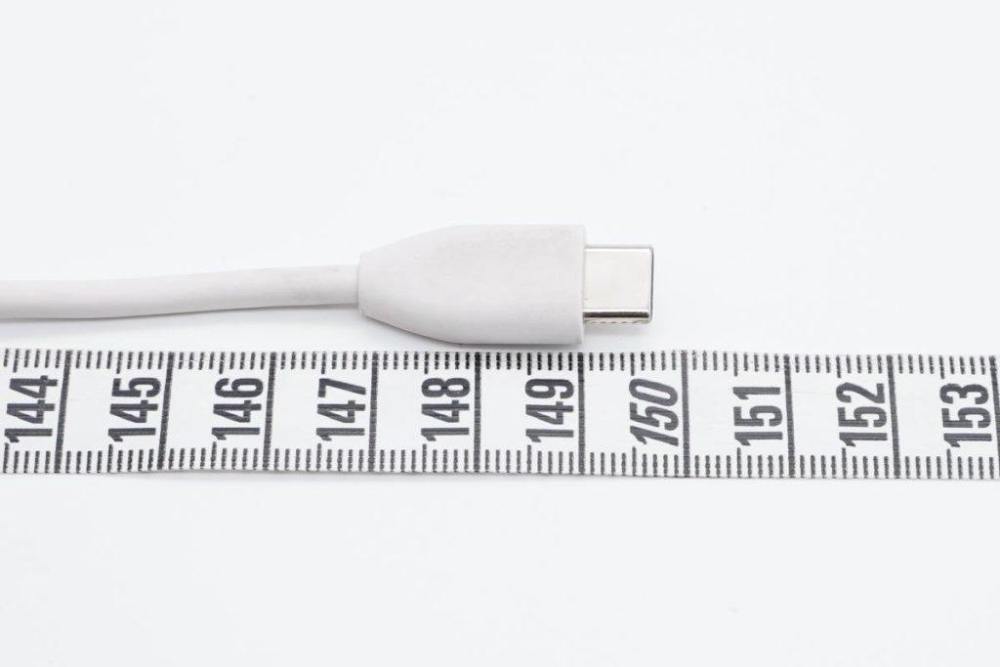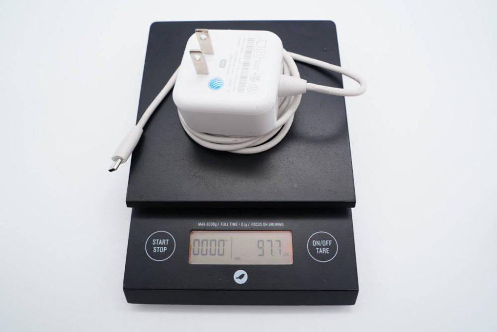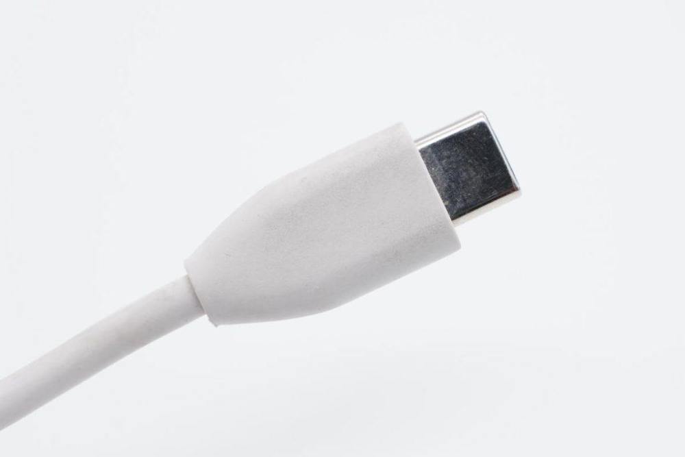 电子充电器是独立的USB-C电缆,具有白色塑料壳和方形设计。
