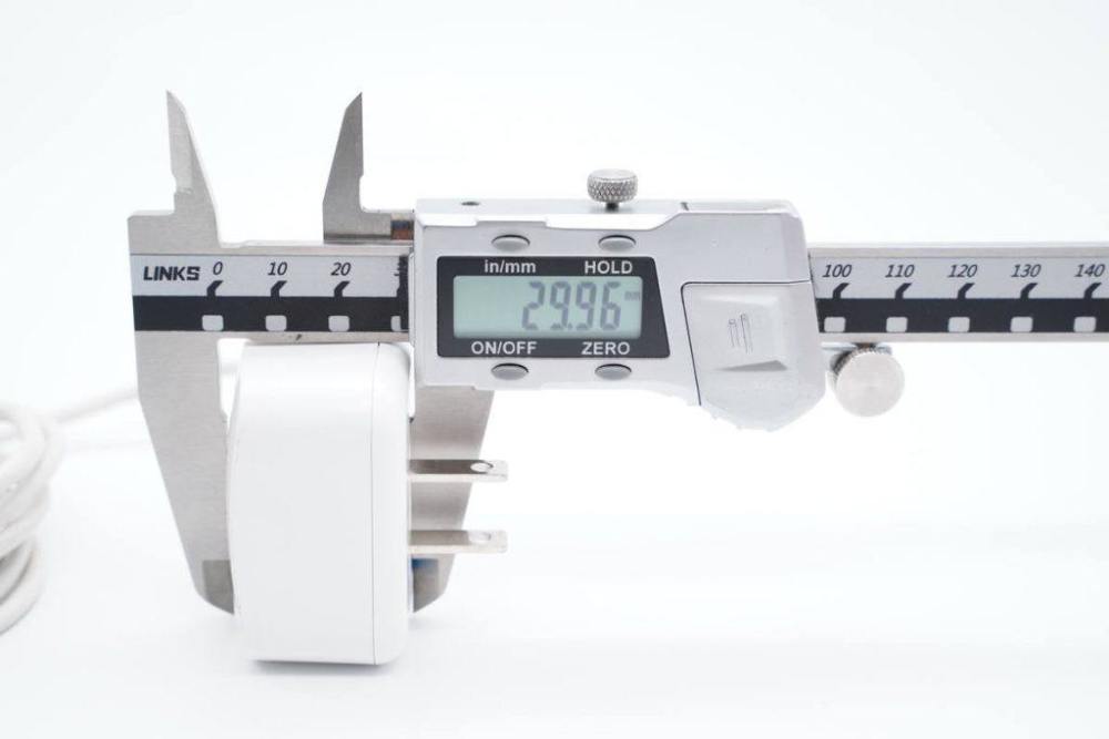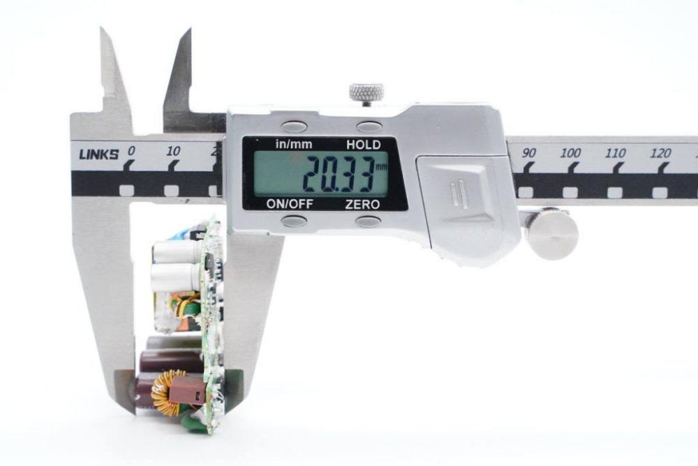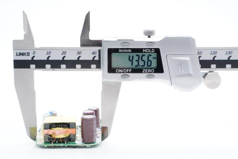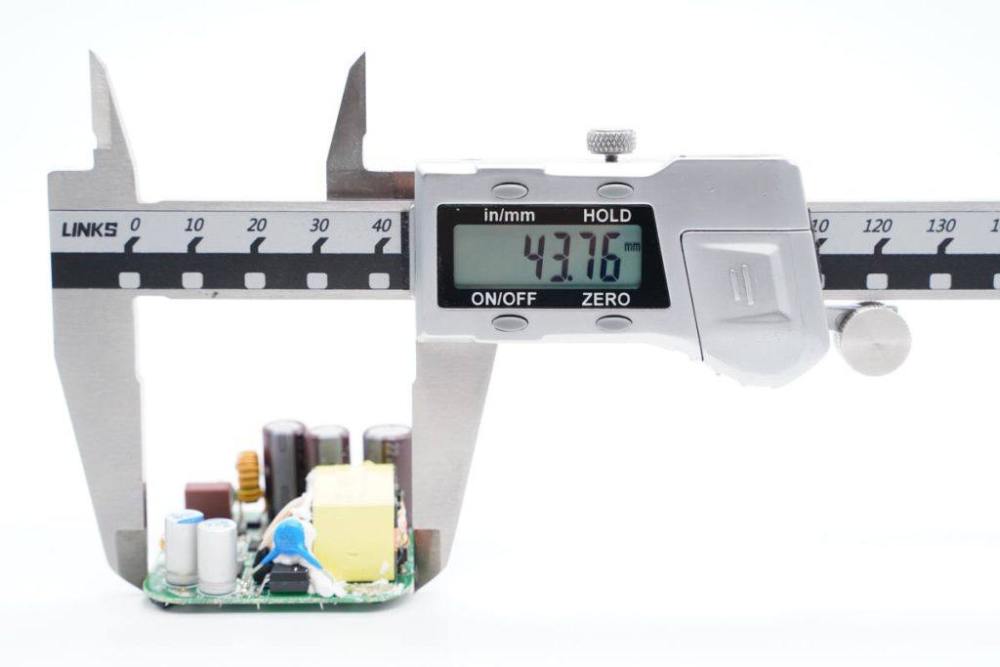 PCBA模块的长度由使用大约43.76mm的导引卡尺度来测量。