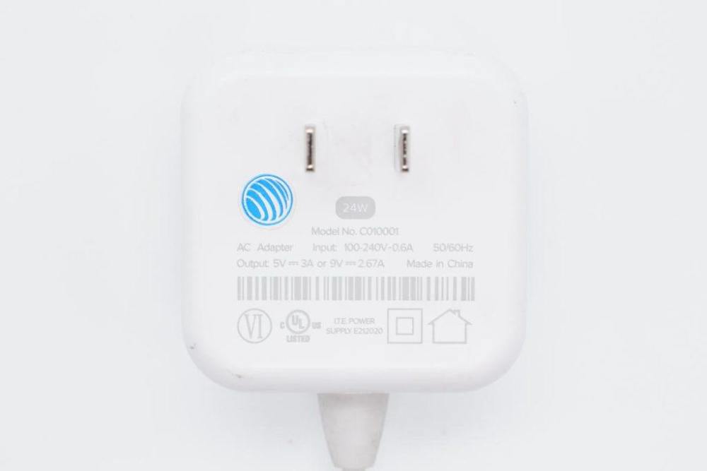 充电器参数印在底壳上,类型C01001,支持100-240V~50/60HZ0.6A输入和5V3A或9V2.67A输出,通过 UL认证和VI级能源效率认证。
