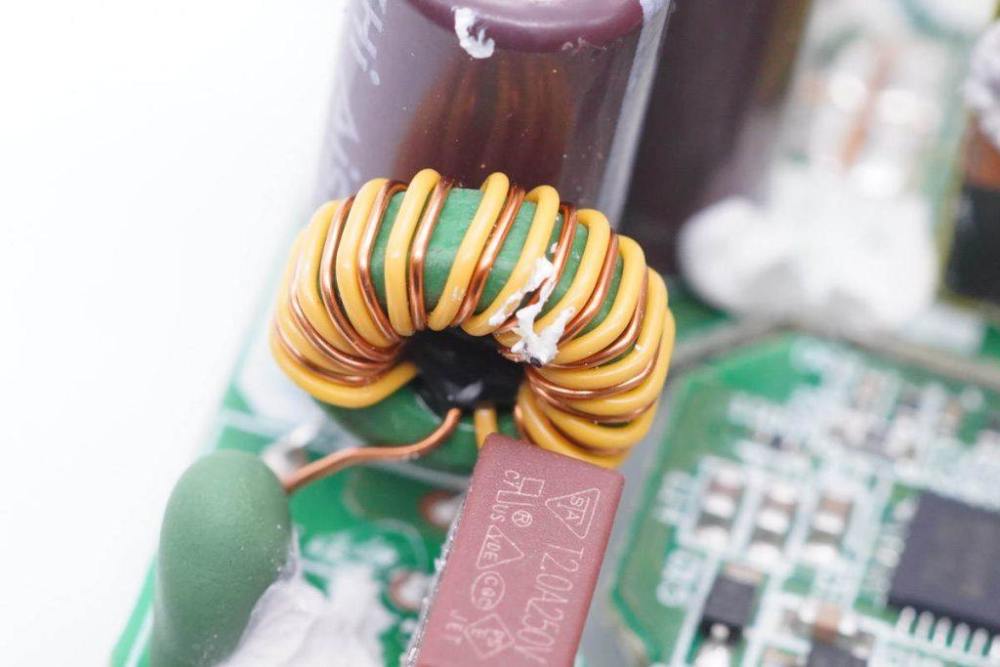 共模感应使用绝缘线和漆包线和环绕一个绿色磁环。