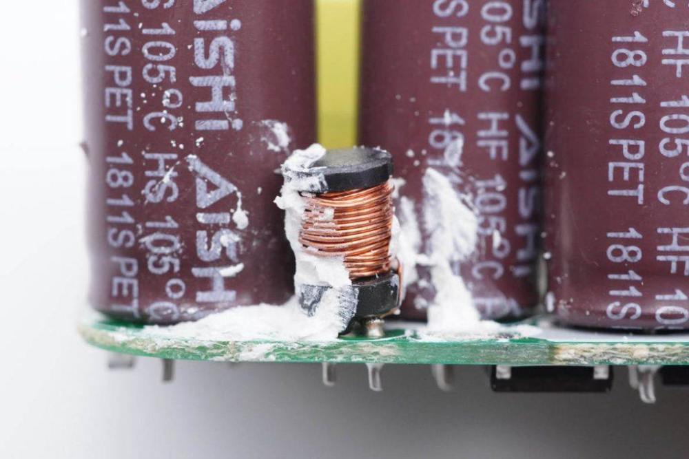 在PCBA模块的前面,左上角为输入接头和共模式感知,左上角为滤波器容量和差模式感知,左下角为输出滤波器固态容量,底部为蓝色Y容量和光耦合,右下边为开关变换器。