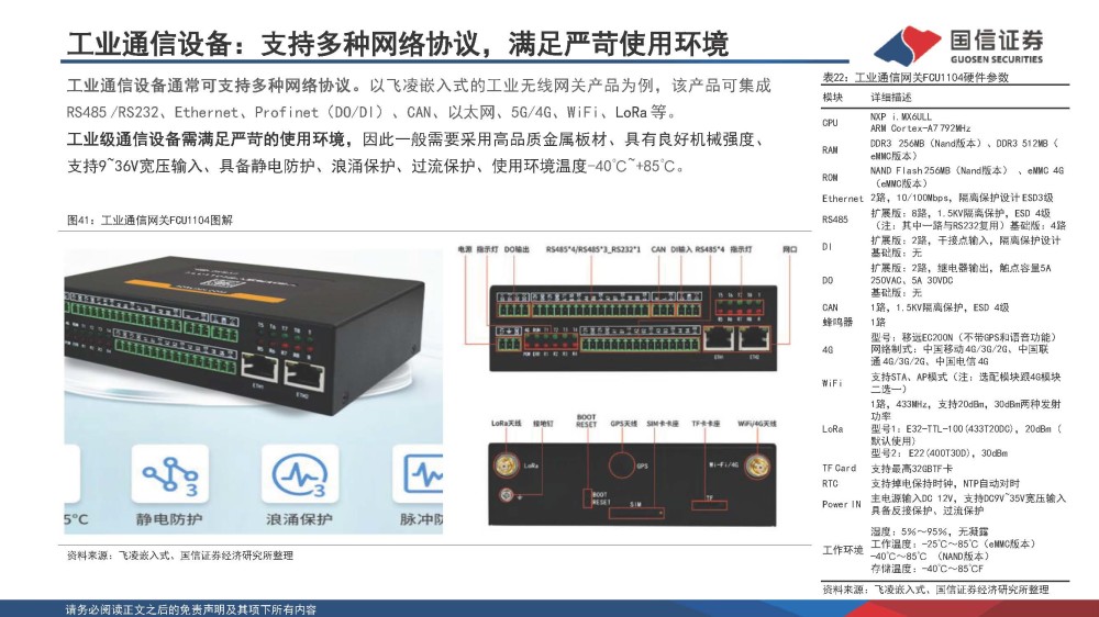 工业通信设备通常支持多个网络协议.举例来说,在飞行中嵌入的工业无线网络产品,该产品可以集成RS485/RS232、Ethernet、 Profinet(DO/DI)、CAN、Ethernet、5G/4G、WiFi、LoRa等。工业通讯设备需要适应使用环境的严峻,因此,一般需要使用高质量金属板,具有良好的机械强度,支持9~36V宽压输入,具有静电保护,波浪保护,过流保护,使用环境温度-40°C~+85°C。