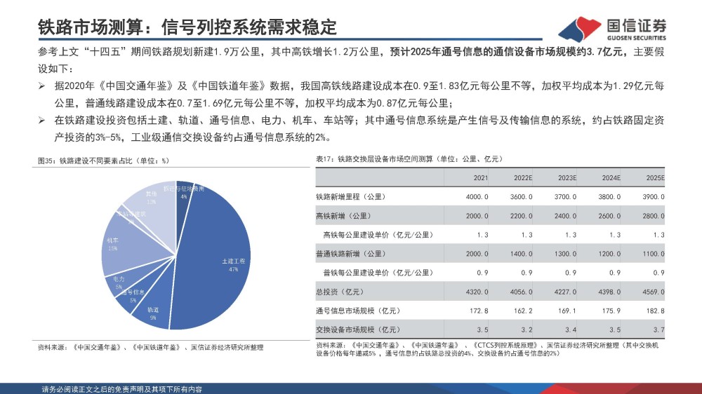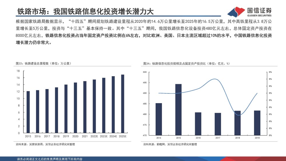 根据国家铁路局的资料,铁路建设计划在2020年14-15年期间为16万公里,到2025年增加到16万公里,高速铁路从380,00立方英里到50,00公里,投资基本上与“五十五世纪”保持一致。其中,在“五十年”期间,中国铁路信息设备投资约达480亿元,总固定资产投资约8亿元,铁路信息投资占今年固定资产投资的6%左右。与欧洲、美国和日本主流地区相比,这一水平超过10%。中国铁路信息投资仍具有巨大的增长潜力。