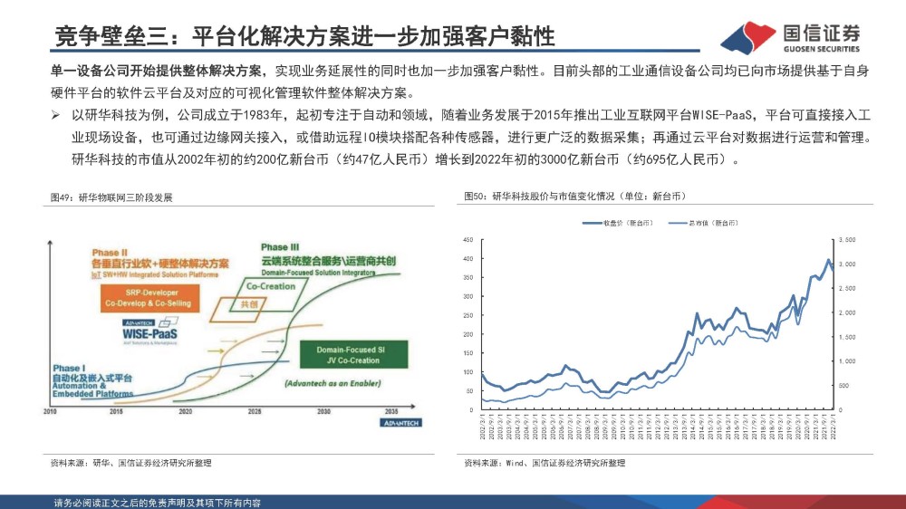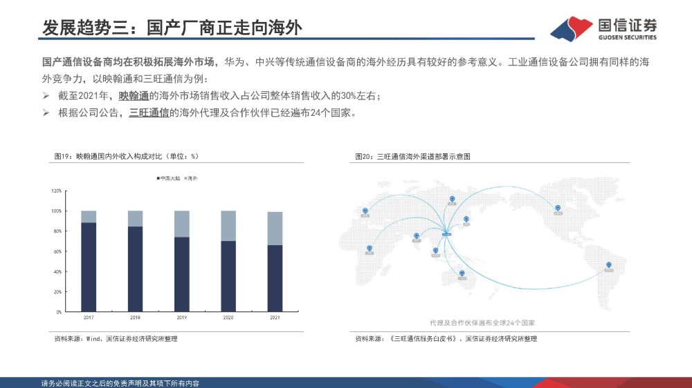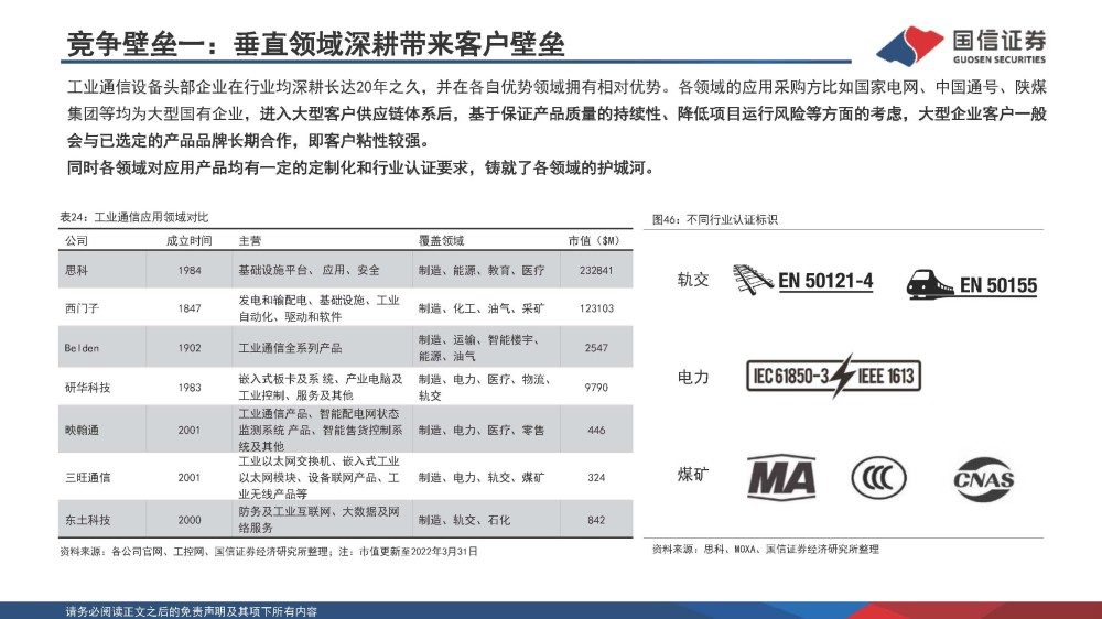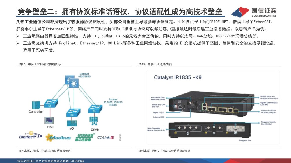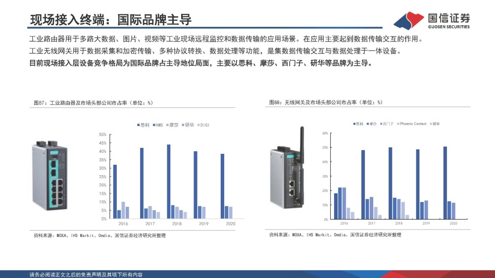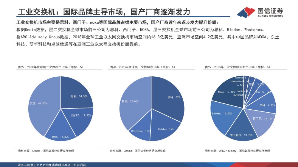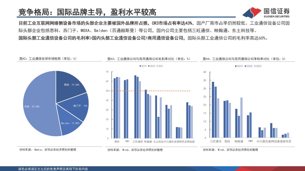目前,行业互联网网络侧设备市场主要由外国品牌主导,CR3的市场份额达到43%。国内制造商的市场份额仍然很低。工业通讯设备公司的国际总部包括Cisco、Siemens、MOXA和Belden国内公司主要包括三旺通讯 、 马安通 、 东东科技等. 国际头部工业通信设备公司的毛利率>国内头部工业通信设备公司>商用通信设备公司,这家国际领先的工业通讯公司总利率高达60%.