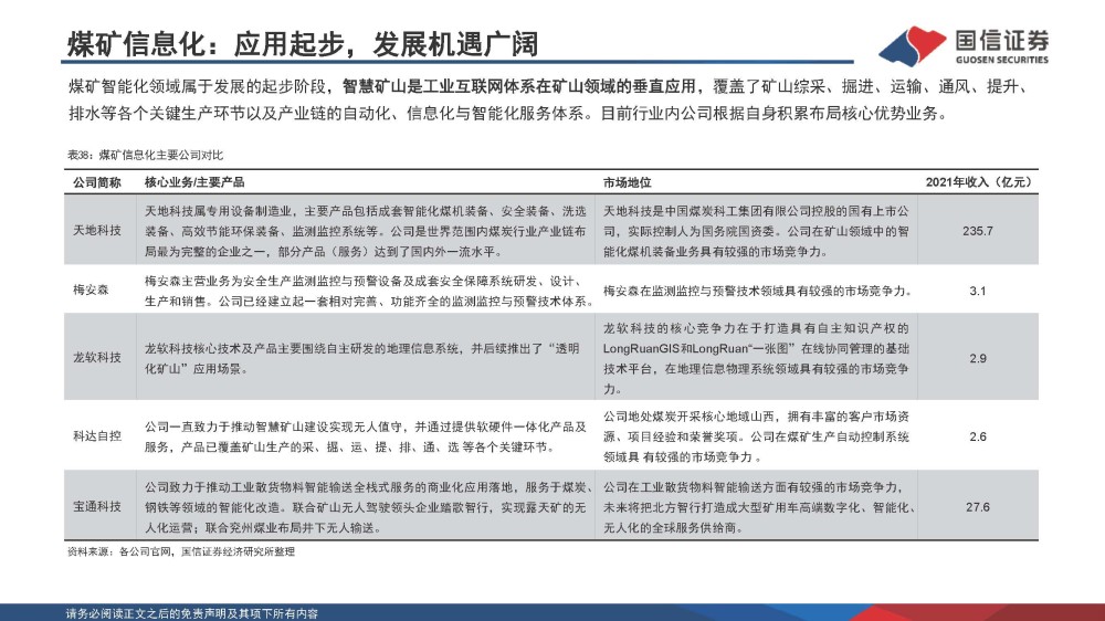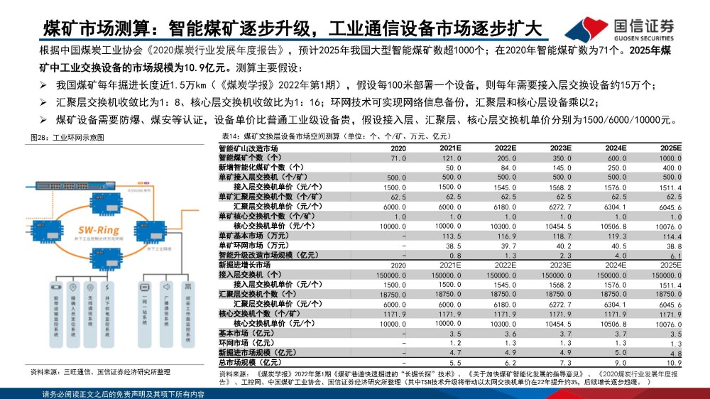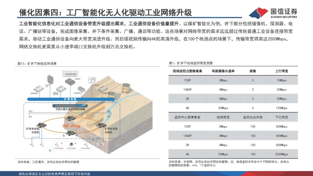 提出了提高工业通信设备带宽的工业智能信息技术需求,提高工业通信设备的价值。 以煤矿智能为例,地下部分包括摄像机、探测器、电话、电台等,完成图像采集、地下条件采集、广播、通信等功能。
