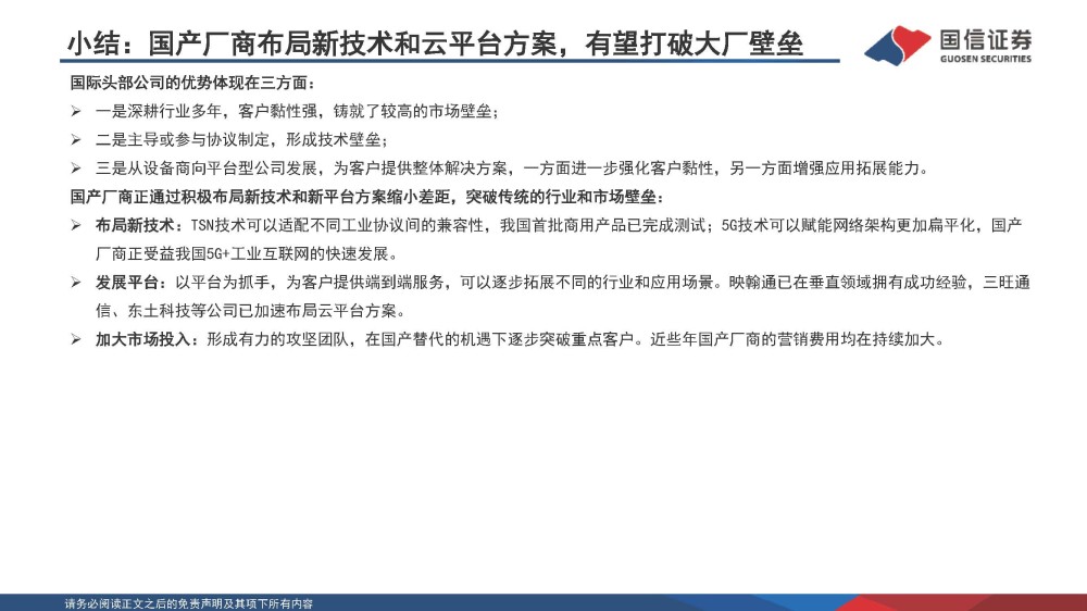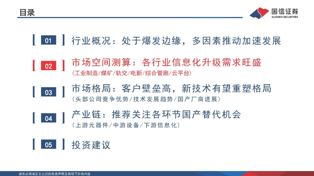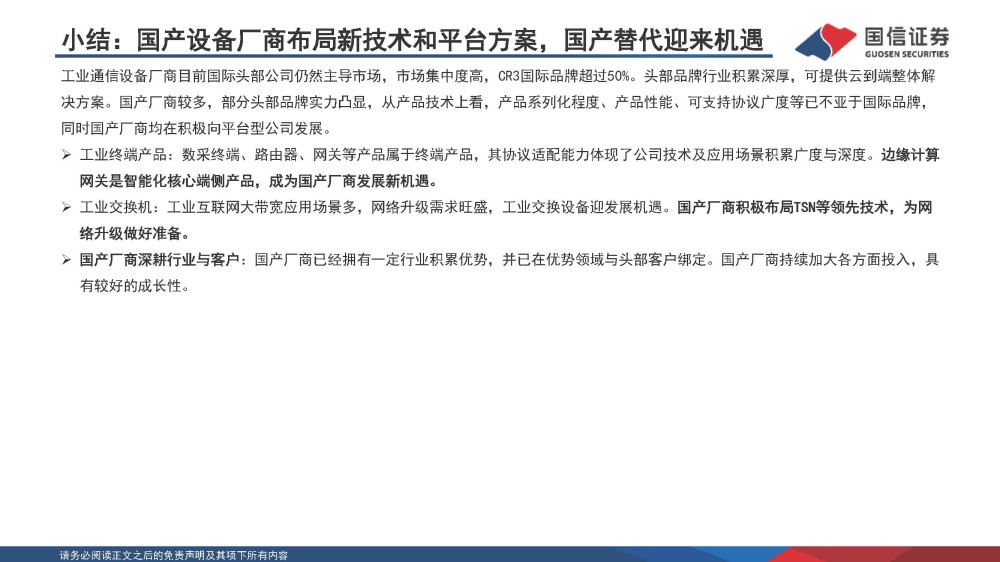 国内自主控制成为各个行业、电力、煤矿、铁路等信息设备发展的主要方向,在新的通信网络部署中,选择国内自主控制品牌更趋向,对国家自主控制设备制造商的市场空间是巨大的。
