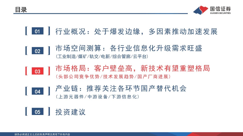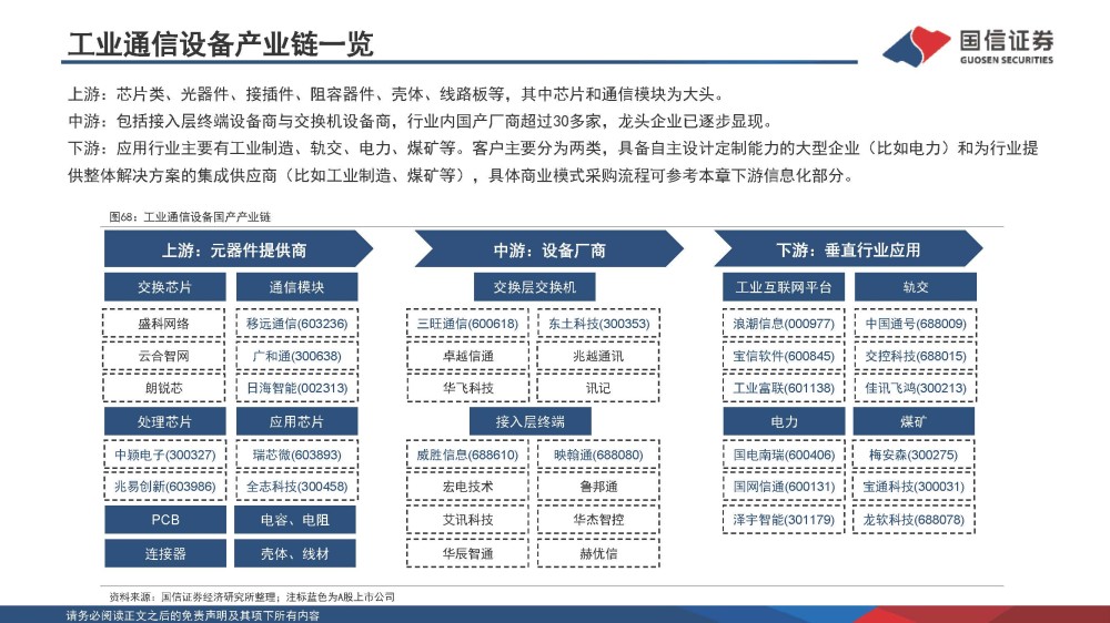 顶部: 芯片类型 、 灯具 、 接口 、 电阻 、 壳 、 电路板等,芯片和通信模块是主要的.中级:包括输入级终端设备公司和交换设备公司,该行业有超过30家国内制造商,长尾企业逐渐出现。低: 应用工业主要包括工业制造 、 铁路 、 电力 、 煤矿等.客户主要分为两类,具有自主设计和定制能力的大型企业(例如电力)和提供全行业解决方案的集成供应商(例如工业制造、煤矿)。