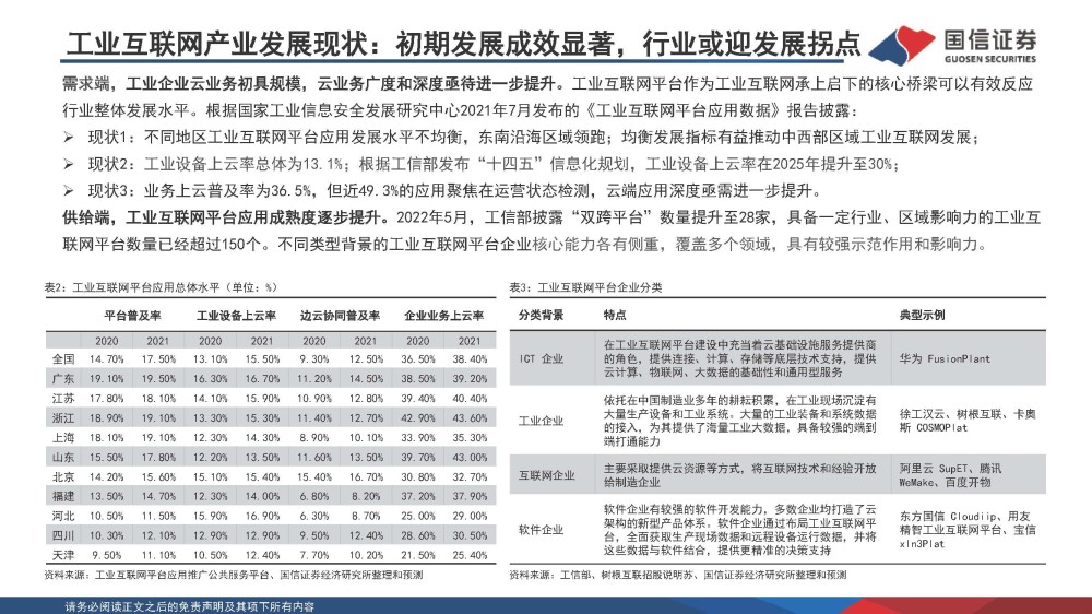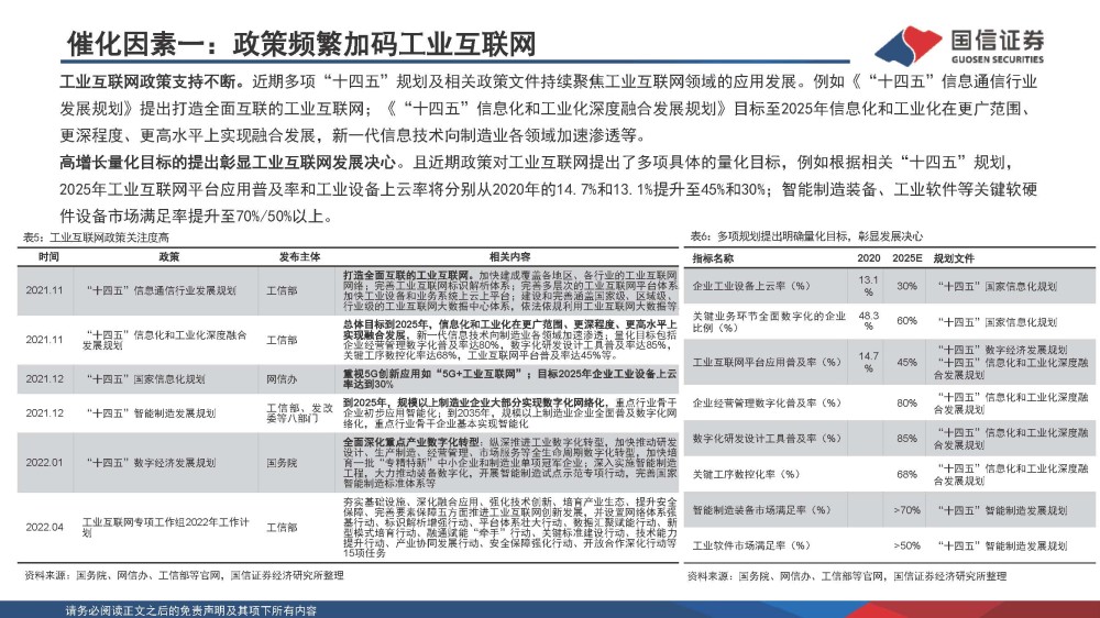 工业互联网政策继续得到支持。最近 的 一些 计划 和 有关 的 政策 文件 继续 着重 发展 工业 互联网 的 应用 。例如, 第14 个 五 级 新闻 和 通讯 工业 发展 计划 建议 建立 一 个 综合 相互 连接 的 工业 互联网 ; 以及 第14 个 五 级 新闻 和 工业化 Deep 一体化 计划 的 目标 是 到 2025年 实现 新闻 和 工业化 的 更 广泛 、 更 深入 和 更 高级 的 一体化 ;新 的 信息技术 正在 加速 进入 制造业 部门 。