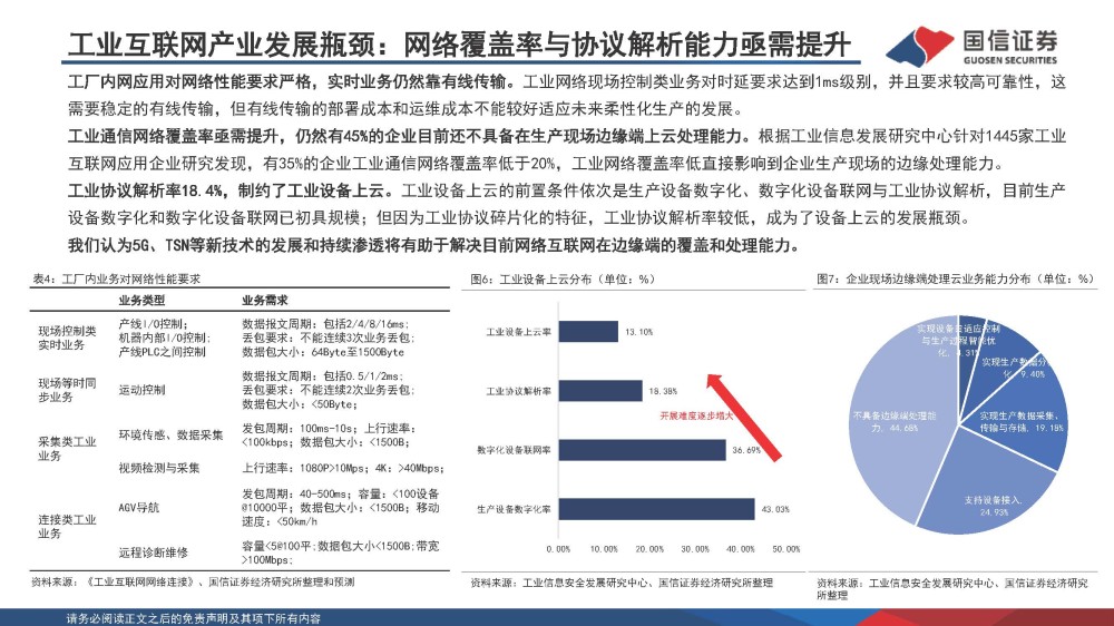 工厂的网络应用严格符合网络性能要求,实时业务仍然依赖于电缆传输。工业网络现场控制业务需要时间延迟达到1ms级,并要求更高的可靠性,这需要稳定的电缆传输,但是,电缆传输的部署成本和运行成本不能更好地适应灵活生产的未来发展。需要提高工业通讯网络的覆盖率。四十五 % 的 企业 仍 没有 在 生产 现场 边缘 的 云处理 能力 。根据工业信息发展中心对1445个工业互联网应用企业进行的研究,35 % 的 企业 的 工业 通讯 网络 覆盖率 低于 20 %,工业网络的低覆盖率直接影响企业生产现场边缘加工能力.