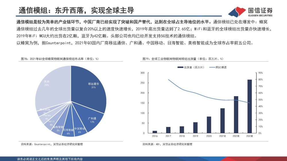 通信模块是一个简单的链路连接,中国制造商取得了突破和国内替代,达到全球主导地位的水平。世界通讯模块在过去几年中快速增长,总共增长率超过20%。截至2019年底,该量已达到2.65亿;全球Wi-Fi和Bluetooth模块也在迅速增长,截至2019年,有200万台Wi-Fi MCU已交付。蓝牙为42亿颗。总部公司还开发了支持5G技术的通讯模块。