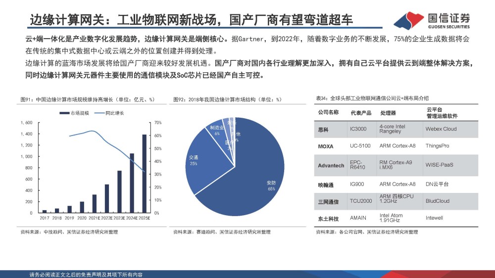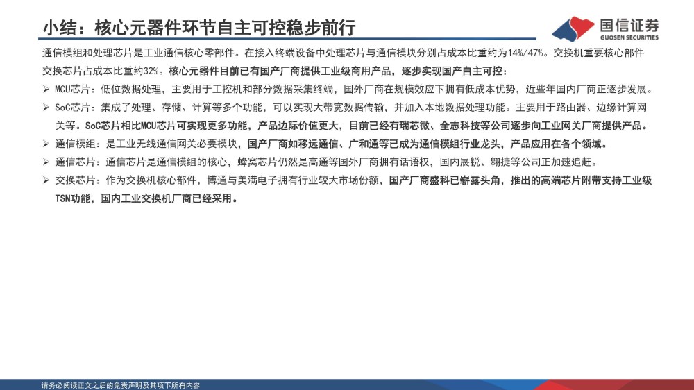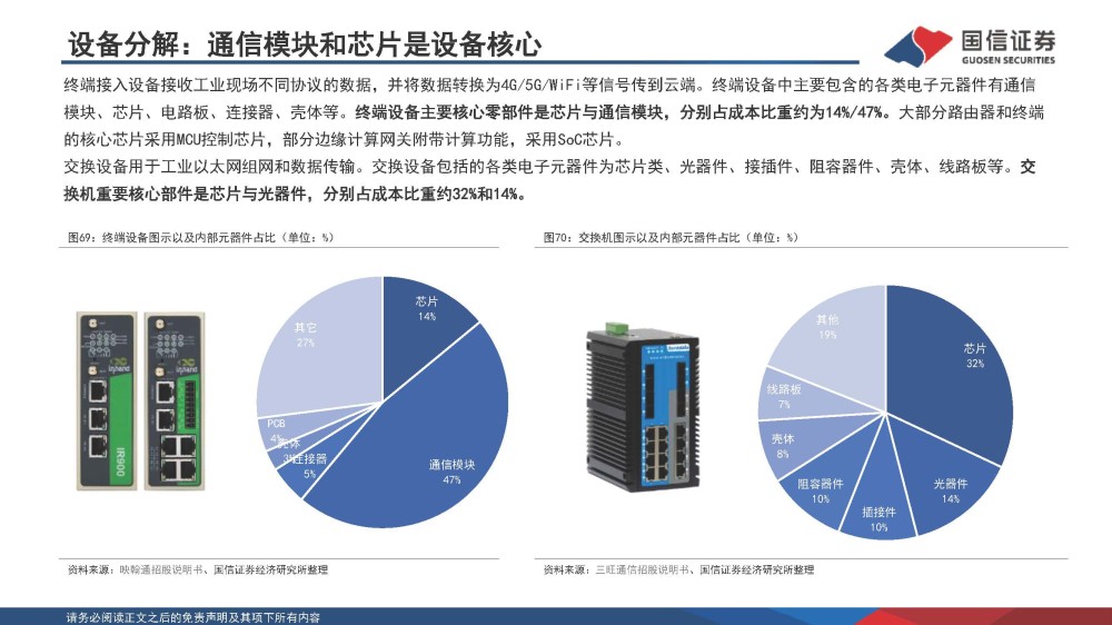 终端访问设备接收来自不同工业现场协议的数据,它将数据转换为4G/5G/WiFi信号到云上。终端设备的主要组成部分包括通信模块、芯片、电路板、接口、壳等。终端设备的主要核心部件是芯片和通信模块。成本-成本比率分别为14 % / 47 % 。大多数路由器和端口核心芯片使用MCU控制芯片,部分边缘计算网络开关附件计算功能,采用SoC芯片。