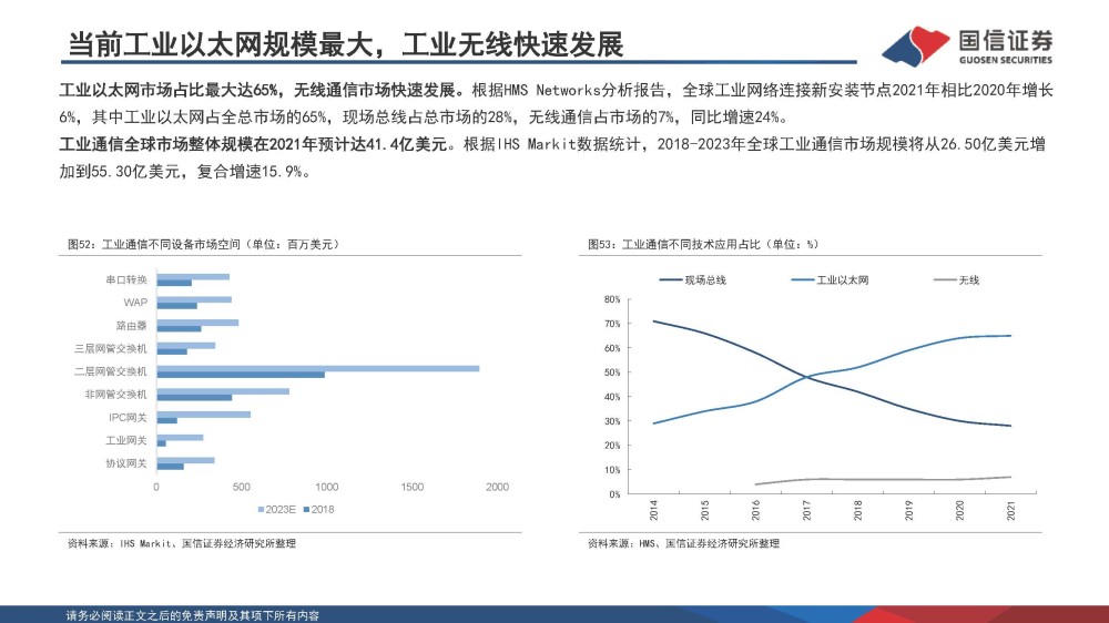 该行业占互联网市场的65 % 。无线通信市场正在迅速发展.根据HMS网络分析报告,2020年,新安装节点的全球工业网络连接率将比2021年增长6%,其中,工业网路占总市场的65 % 。田线占总市场28%。无线电通信占市场7%,同比增速24%。全球工业通讯市场预计在2021年增长到41亿美元。根据国际卫生组织马克里特数据统计,全球工业通讯市场将从2018-2023年增长26亿美元,增长50亿美元,达到55.30亿美元,整体增长率为15.9%。
