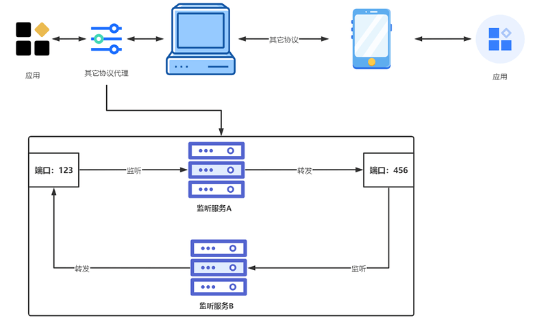 其他协议比索克塞特更冷,无合适的代理工具。测试人员需要写自己的代理人,比如串口协议,虽然Python支持Pyserial接收序列,但无代理。测试者需要在这个点上写出自己的字符串代理工具。这 一 进程 需要 开放 两 个 监测 服务,如下图,监察服务 A 监察终端123,如果有数据进来,发送(或更改数据,实现模板)到456端口,监察服务B一致性: