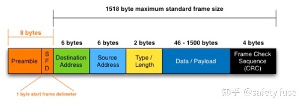 由于Ethernet II的最大数据帧是1518字节,切出Ethernet帧的帧头(DMAC目标MAC地址48bits=6Bytes+SMAC源MAC地址48bits=6Bytes+Type域2Bytes)14Bytes和帧末端CRC校正部分4Bytes然后, loaded的其他顶层协议,即最大数据域,只有1500Bytes。