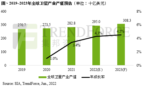 2022年,美国、中国和英国将积极促进低轨卫星的部署。国际电信联盟(ITU)对轨道、频谱规格和全球宽带需求的巨大增长带来了增长的动力。此外, 卫星 互联网 被 视为 远距离 、 农村 和 海外 移动 运营商 的 主要 通信 解决 办法,结合卫星通信技术与地面网络,发展混合网络,提高频率宽度和覆盖率.根据 TrendForce总咨询估计数,到2023年,全球卫星工业将价值30.83亿美元。每年增长率为4.5%。