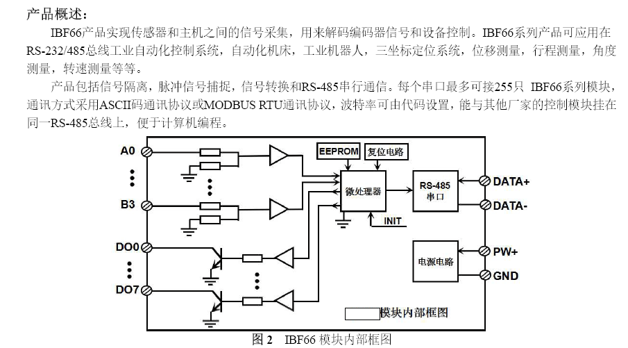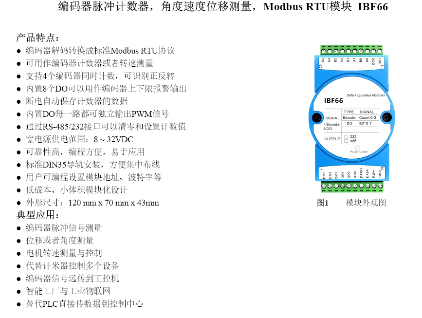 产品包括脉冲信号捕捉,信号转换和RS-485串行通信。最多可连接255个IBF66系列模块到每个系列端口。采用ASCII通信协议或MODBUSRTU通信协议,批量率可以按代码设置,控制模块可以与其他制造商一起安装在同一RS-485总线上,便于计算机编程。 IBF66产品实现了传感器与主机之间的信号采集,用于解码编码器信号和设备控制。IBF66系列产品可用于RS-232/485总线工业自动化控制系统,自动化机床,工业机器人,三坐标定位系统,位移测量,行程测量,角度测量,转速测量等等。