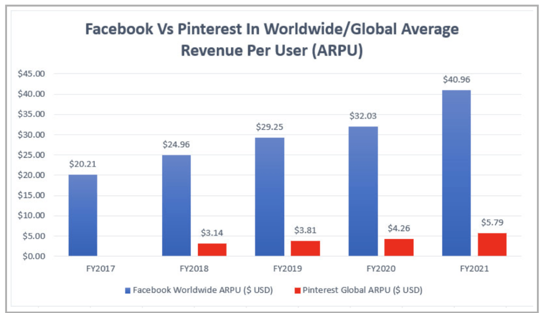 在2021年,Facebook的ARPU比2020年增长近30%,在财政年度末达到41美元;类似地, Pinterest的ARPU也在增长,虽然在2021年只有5美元。