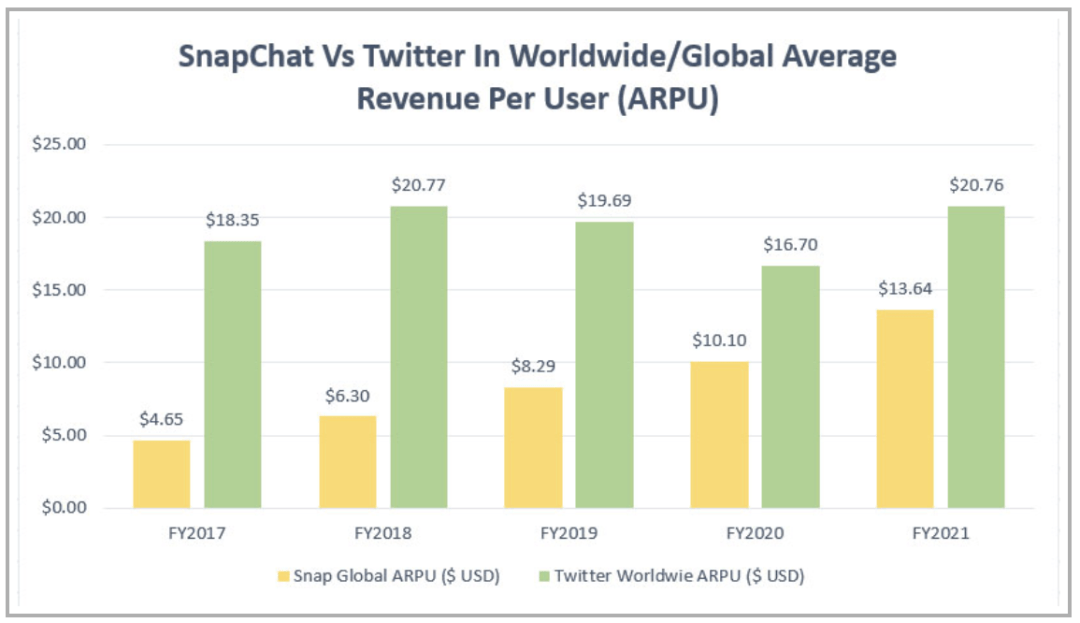对于Facebook和 Pinterest,ARPU定义为某一区域在某一季度的总收入,或该区域的MAU或季度开始和结束的平均MAU的比率;而Snap和Twitter定义ARPU为该区域的季度收入与平均DAU的比率。