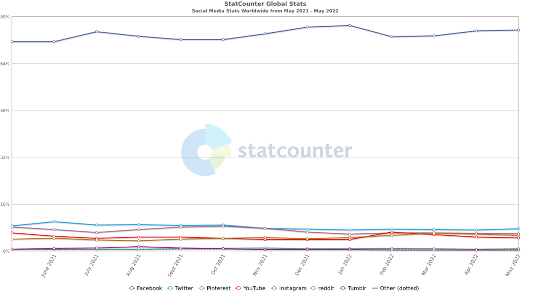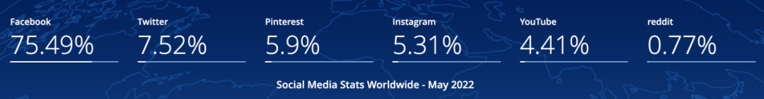 根据统计柜台的统计数字,截至今年5月,Facebook仍然是全球社交媒体市场最大的股东,至75.49 %, 其次是Twitter 、 Pinterest 和 Instagram,该股分别占7.52%,5.9%和5.31%。