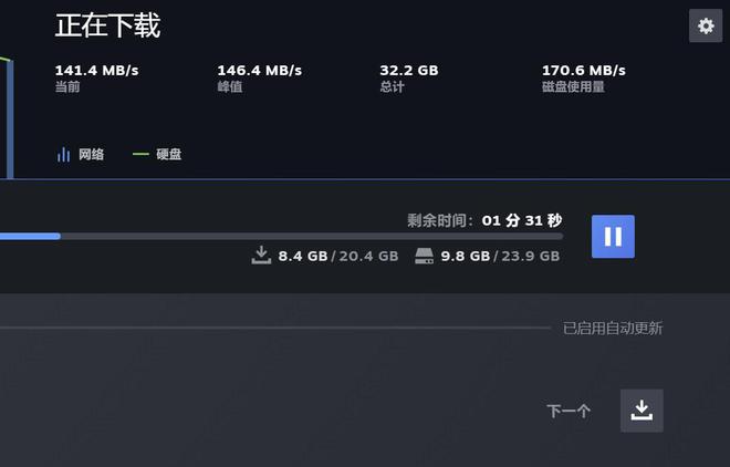因此作者经常遇到一个情况,当下载速度更高时,处理器负载就越高,当处理器负荷达到峰值时,网速就开始不稳定。当作者打开多个虚拟机系统时,然后当你运行Steam下载时,最大140MB/s下载速度,但网络的速度将非常不稳定,有时下载将直接到零,然后运行到非常低的下载速度。