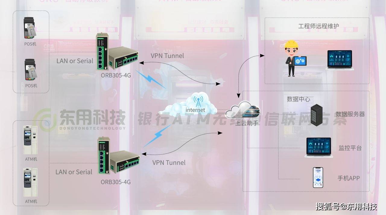 银行自动取款机无线通讯网络系统采用高速、低时延、多通道ORB305工业级无线路由器的特点,结合IoT技术,监测和收集ATM机网络状况、机故障等项目数据。通过搭建的隧道,将数据上传到数据服务器上,协助管理人员进行分析和处理,大大提高了维修人员的效率.