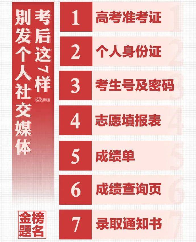 6月12日,人民日报(People's Daily Weibo)发布公告,提醒候选人不要向诸如朋友、家人等社交媒体发布七类内容。 如不打算取得个人资料,则可能被用来进行准确的欺诈。