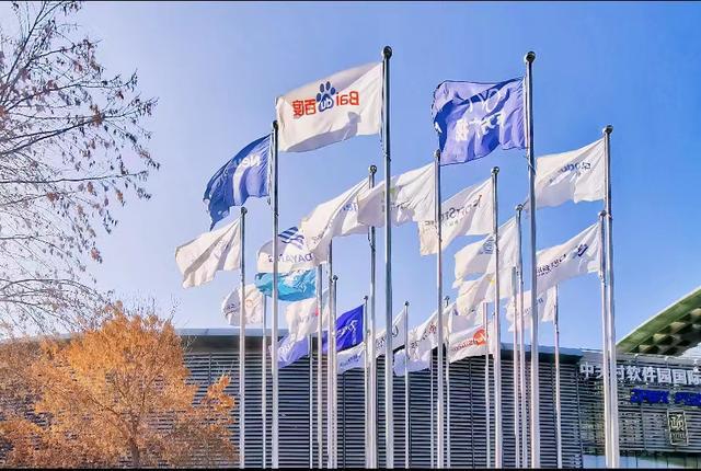 在北京中关村的软件公园里,大型互联网平台企业的旗帜飘浮在风中。