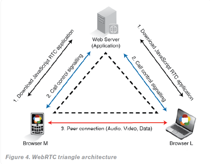 在这种架构中,手机被称为“浏览器M”,而笔记本电脑被称为“浏览器L”,通过网络服务器连接它们。 为了建立实时媒体通信,这两个设备需要了解彼此的媒体功能,并通过交换呼叫消息实现控制协议。