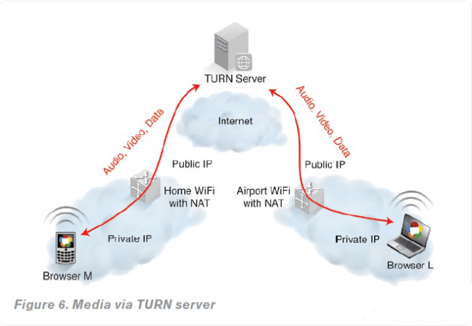 5.然而,如果您有高度限制的NAT或防火墙,这个直接路径不会被建立,只到达Turn服务器。 结果是媒体通过Turn服务器分支传输(如图所示)。
