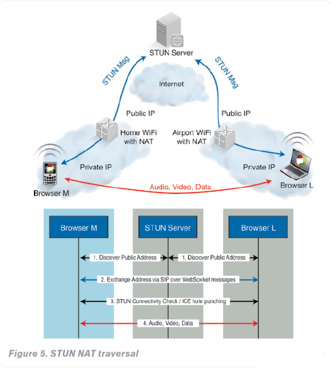 WebRTC使用P2P媒体流,通过浏览器直接实现音频、视频和数据的连接。但是,浏览器隐藏在NAT和防火墙后面,这增加了建立P2P媒体对话的难度。这些流程和协议,像冰雪或小冰雪一样,STUN和 TURN,建立一个P2P媒体流至关重要。