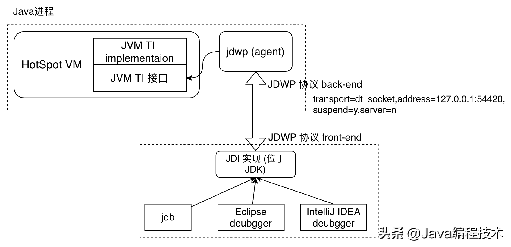 JDK通过SPI模式( lib/tools.jar)为JDI提供了具体的实现,它是一个完全实现的JDWP协议的后端,允许远程连接、连接、监控和控制目标JVM。