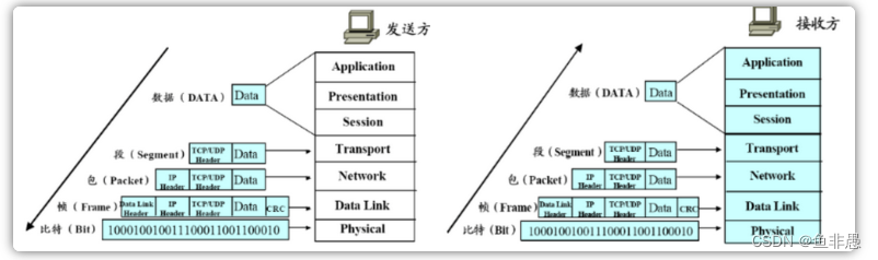 网络的实际运行过程是发送者,从高层向底层,根据协议,数据是层层填充的,每个层都附有层协议的头部;以及接收器,从底层向高层,不断的解封数据包,删除每个层的协议的标题,然后最高应用程序层获取应用程序层数据: