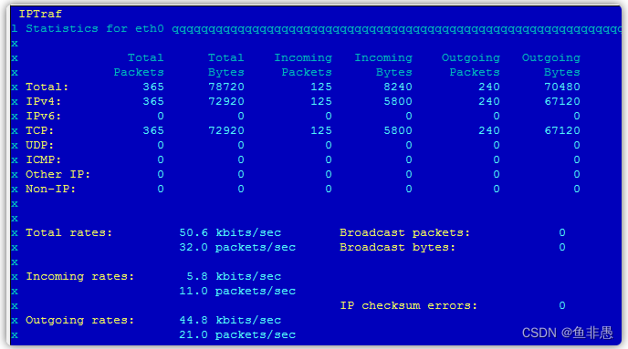 一般使用方法: iptraf -i eth0, iptraf -g eth0, iptraf -d eth0, iptraf -l eth0