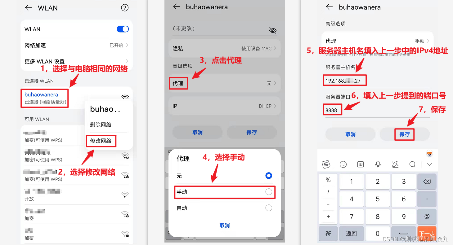 手机系统设置-->WLAN-->修改网络-->高级选项-->代理-->选择手动-->主机名填入上一步IPv4-->端口填入默认的8888-->保存