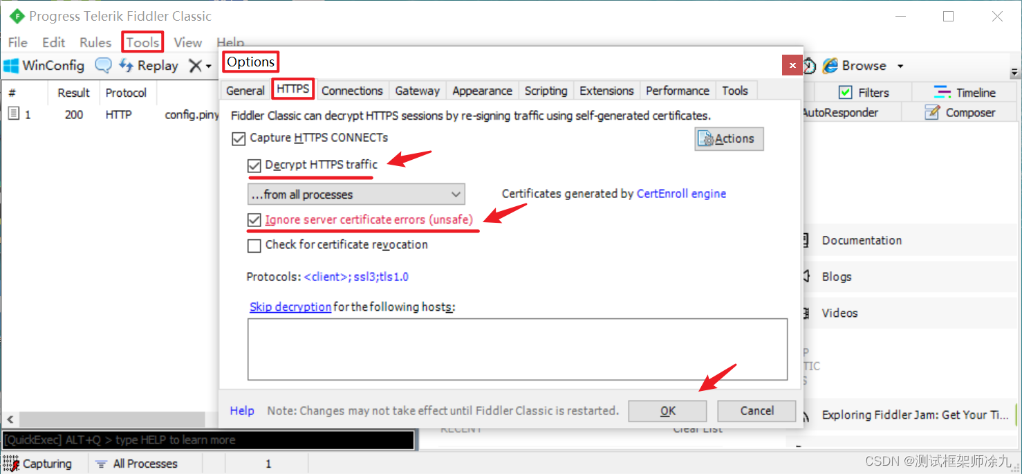 设置步骤:Tools-->Options-->HTTPS-->勾选Decrypt HTTPS traffic-->再勾选Ignore server certificate errors-->点击OK
