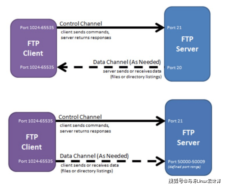 FTP在传输层中使用TCP,它还需要两个平行的TCP连接:控制连接和数据连接。控制连接在整个会议期间保持开放,数据传输完成后,数据连接被关闭。使用21号端口控制连接。数据连接使用20号端口。