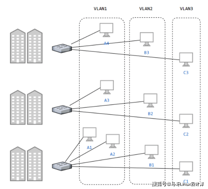虚拟LAN可以创建与物理位置无关的逻辑群。只有同一虚拟域网的成员才能接收广播信息,例如,下图(A1,A2,A3,A4)属于虚拟域网,A1发送的广播将由A2、A3、A4接收,而其它站点收不到。