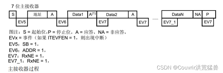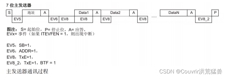 (1) 起始信号 (S) 由主机端生成并控制初始信号(S) 当一个初始信号发生时,它触发一个事件 EV5 ”,并会对 SR1 寄存器的“ SB ”位置 1 ,表示起始信号已经发送;