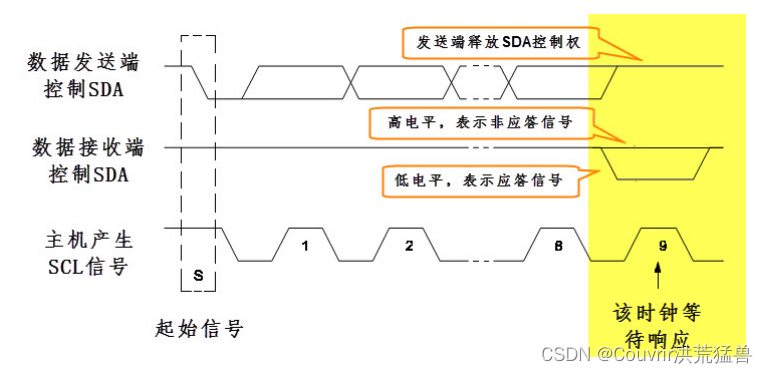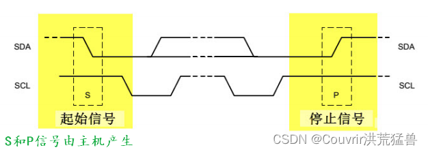 当 SCL 线是高电平时,SDA线由高电平向低电平切换,表示通讯的起始。
