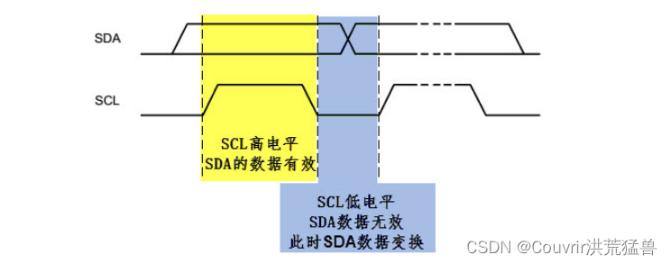 当 SCL 为低电平时, SDA 数据无效,目前通常是SDA 执行电位调整开关,为下一次做好数据准备.
