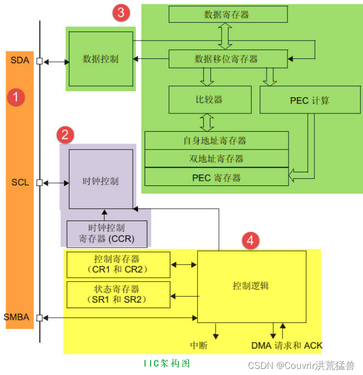 整个控制逻辑负责协调整个 I2C 外部控制逻辑的工作模式根据我们配置的控制注册表(CR1/CR2)的参数改变。 当外部工作时,控制逻辑将根据外部工作状态修改状态注册表(SR1) 和 SR2) 我们可以通过简单的阅读与这些登记册有关的登记册来理解这一点 I2C 工作状态。 此外,控制逻辑负责对I2C的生产控制 中断信号、 DMA 请求及各种 I2C 通信信号(启动、停止、响应信号等) ) 。