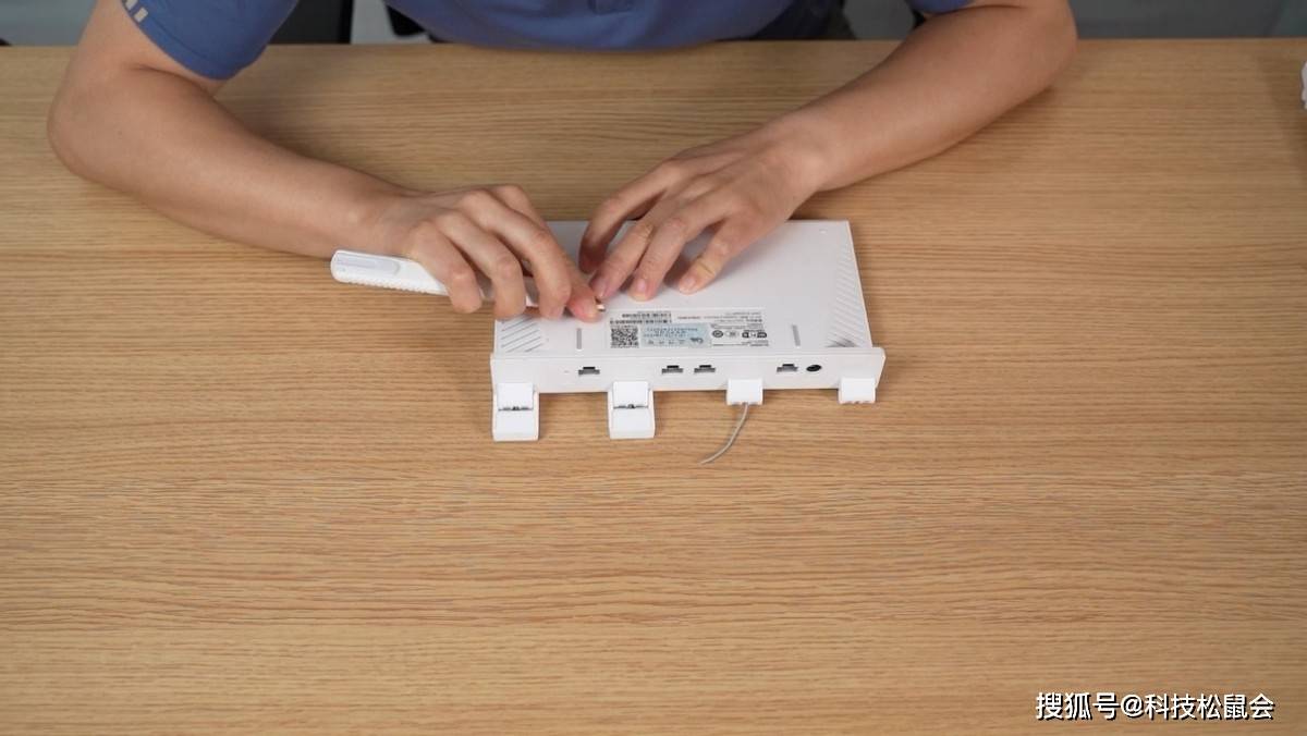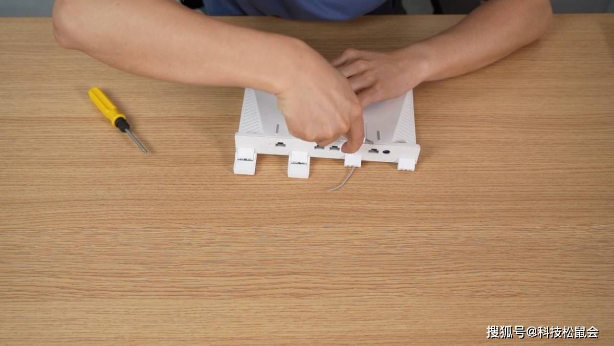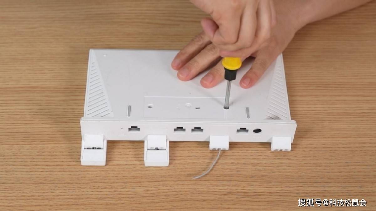 拆卸标签后,我们看到两根螺钉,把螺钉旋转,把它们放在一起,然后用刀或塑料片从上面拉出路由器。