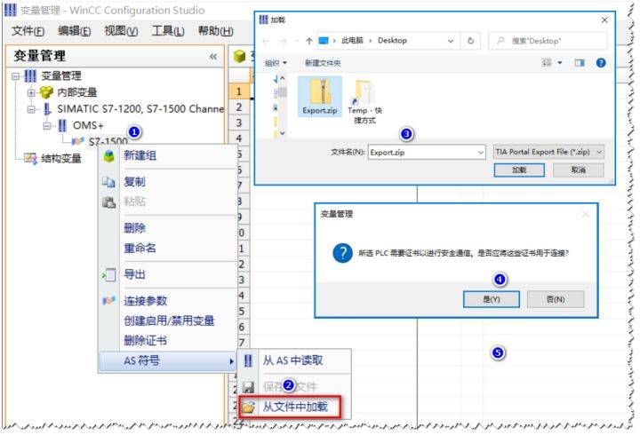 SIMATIC WinCC V7. 在5SP2 UPD4和更高版本的项目中,可以通过创建通信连接来加载SCADA数据包,当加载时将提示证书的进口。
