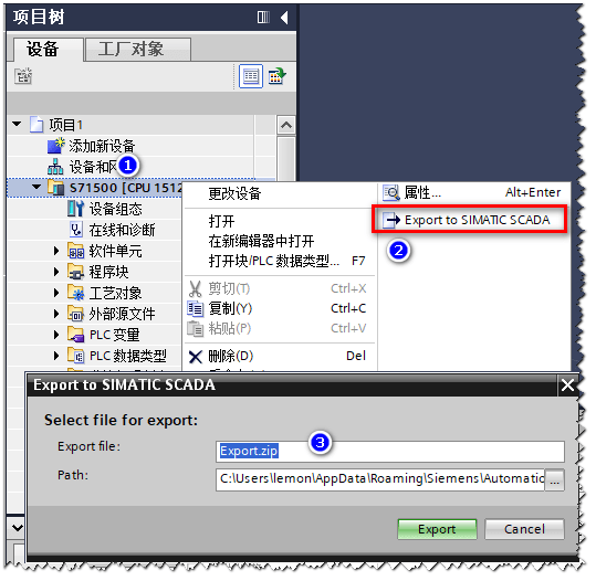 下面的图示了如何从TIA门户项目导出SCADA数据包,SCADA数据包包含在PLC中可访问的证书和变量信息。然后将SCADA包复制到您需要配置或运行的SIMAITC WinCC项目计算机上。