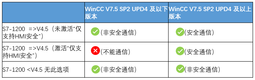 这个选项的意思是不要激活HMI安全通信功能,这是一个与HMI不安全的通信的兼容问题.由于版本低于V7.5 SP2 UPD4 SIMAITC WinCC软件不支持HMI安全通信,为了配合早期温CC项目,S7-1200/S7-1500具有新的固件版本需要取消此选项,才能与之通信。下面的表是SIMATIC WinCC和S7-1200/S7-1500 CPU安全通信的配置选项的参考。